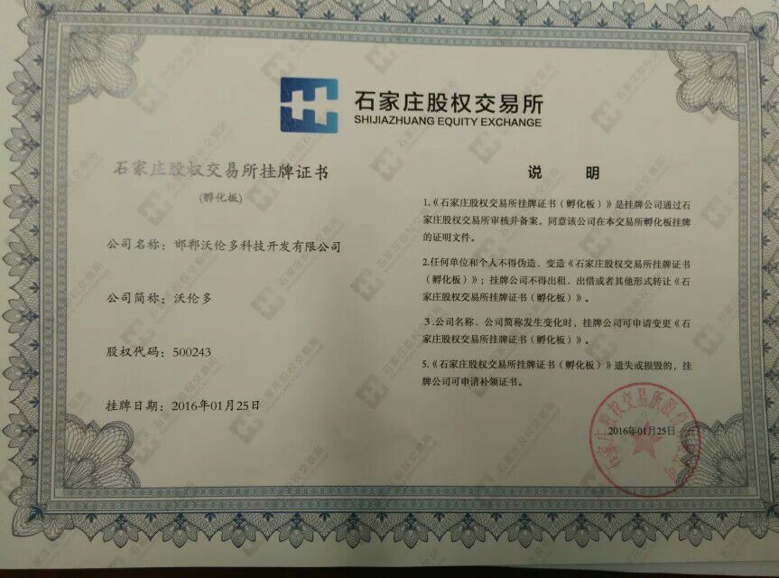 在2016年1月25日,邯鄲高科園區企業邯鄲沃倫多科技開發有限公司在石家莊股權交易所成功掛牌,成為邯鄲市在“石交所孵化板”成功掛牌的屈指可數的科技型創業企業。掛牌證書于近日下發,標志著邯鄲沃倫多科技開發有限公司的發展進入了一個新的里程碑。